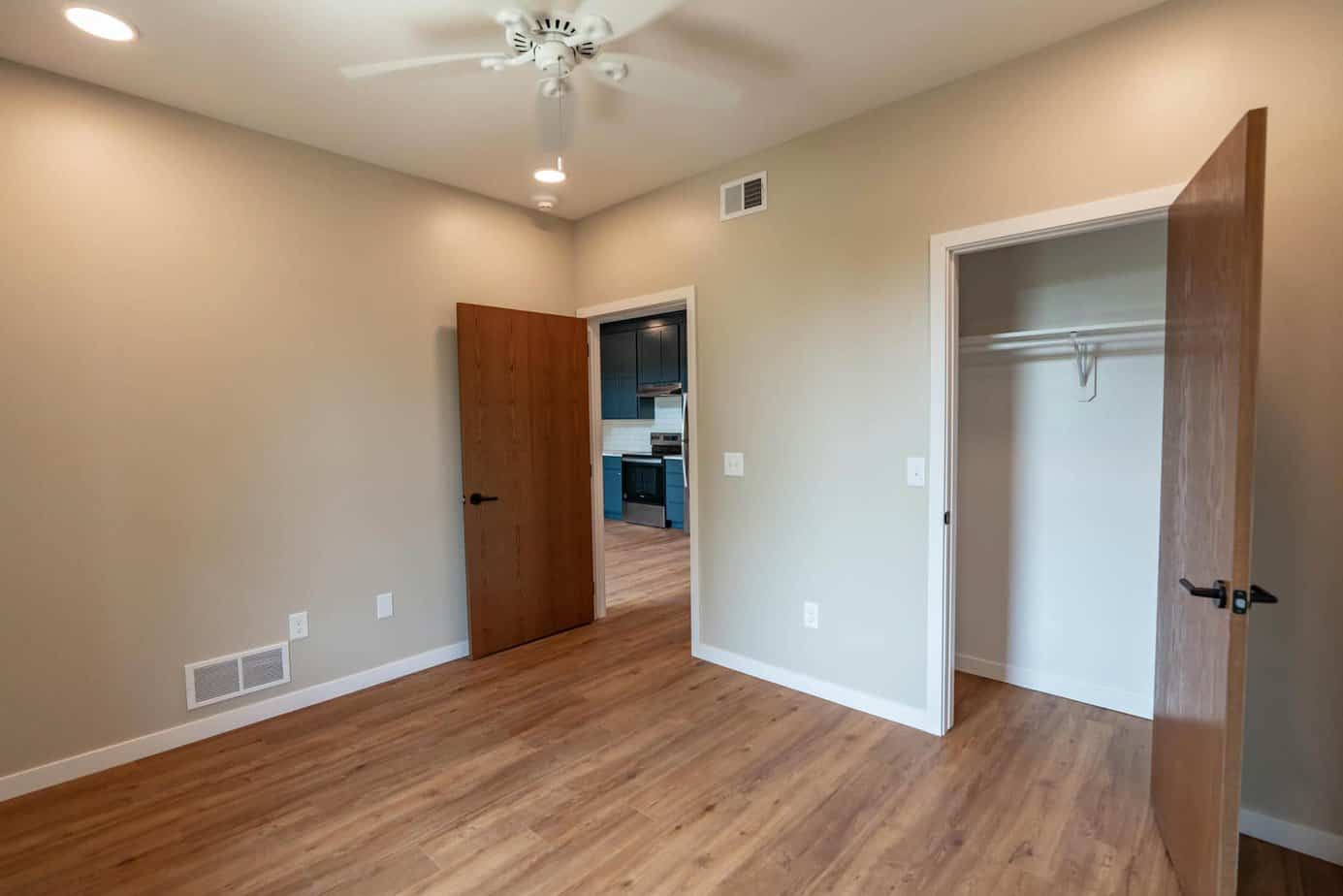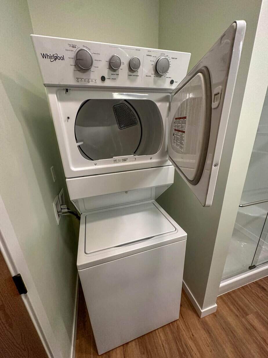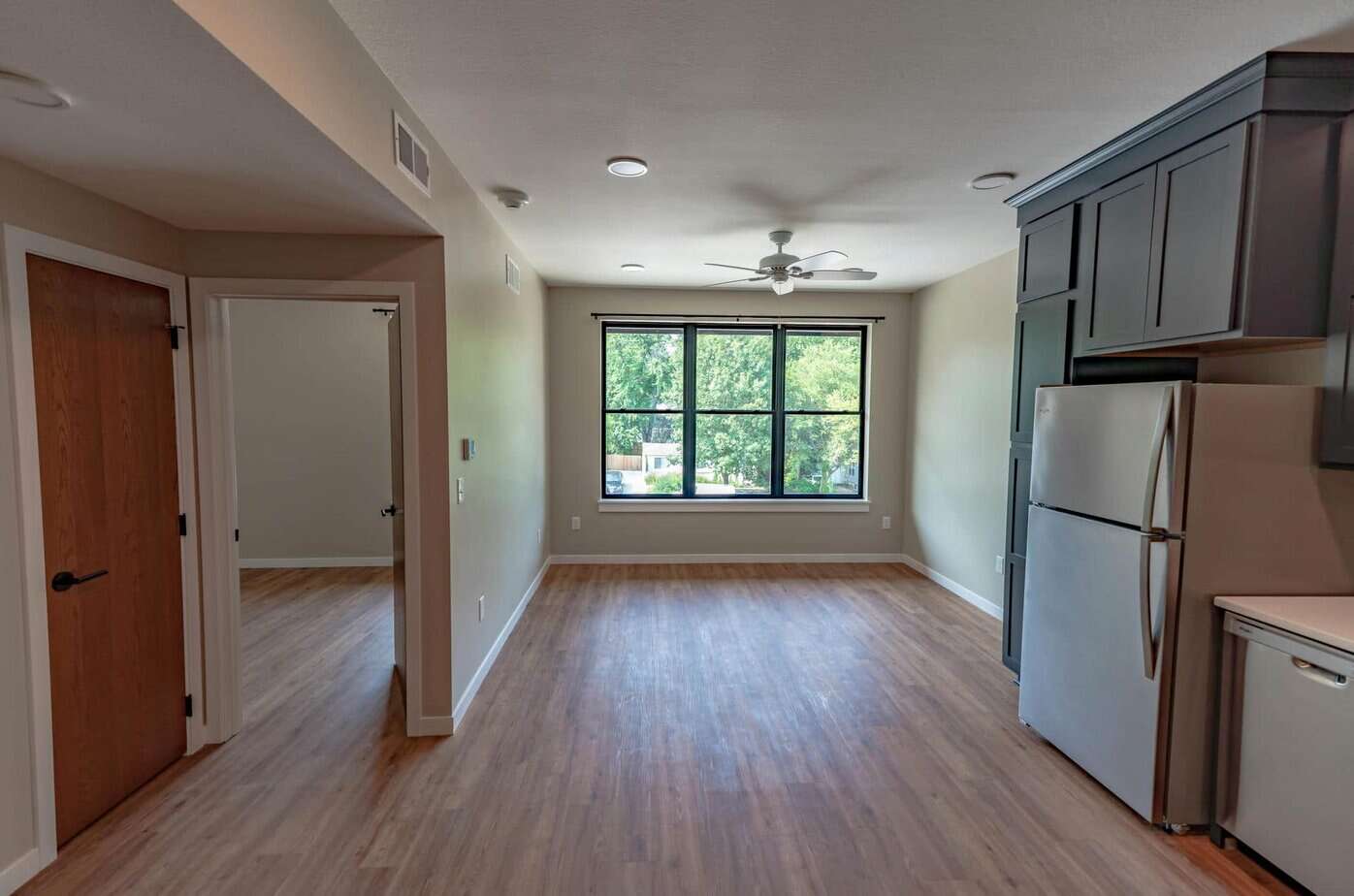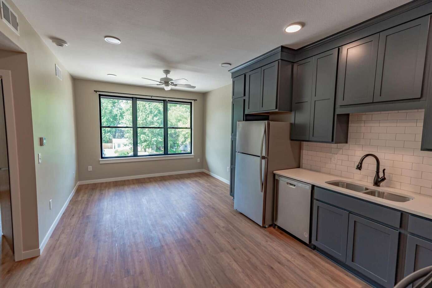 The bedroom is roomy enough for a king-sized bed and full dresser with a sizable built-in closet. The open kitchen embraces functionality with stainless-steel appliances and generous modern cabinetry that cater to any culinary need. A stacked washer and dryer are tucked comfortably into a large bathroom closet with plenty of storage. With KSU across the street and only a short walking distance to MCC and Aggieville, Apartment 1220 offers on/off-street parking.