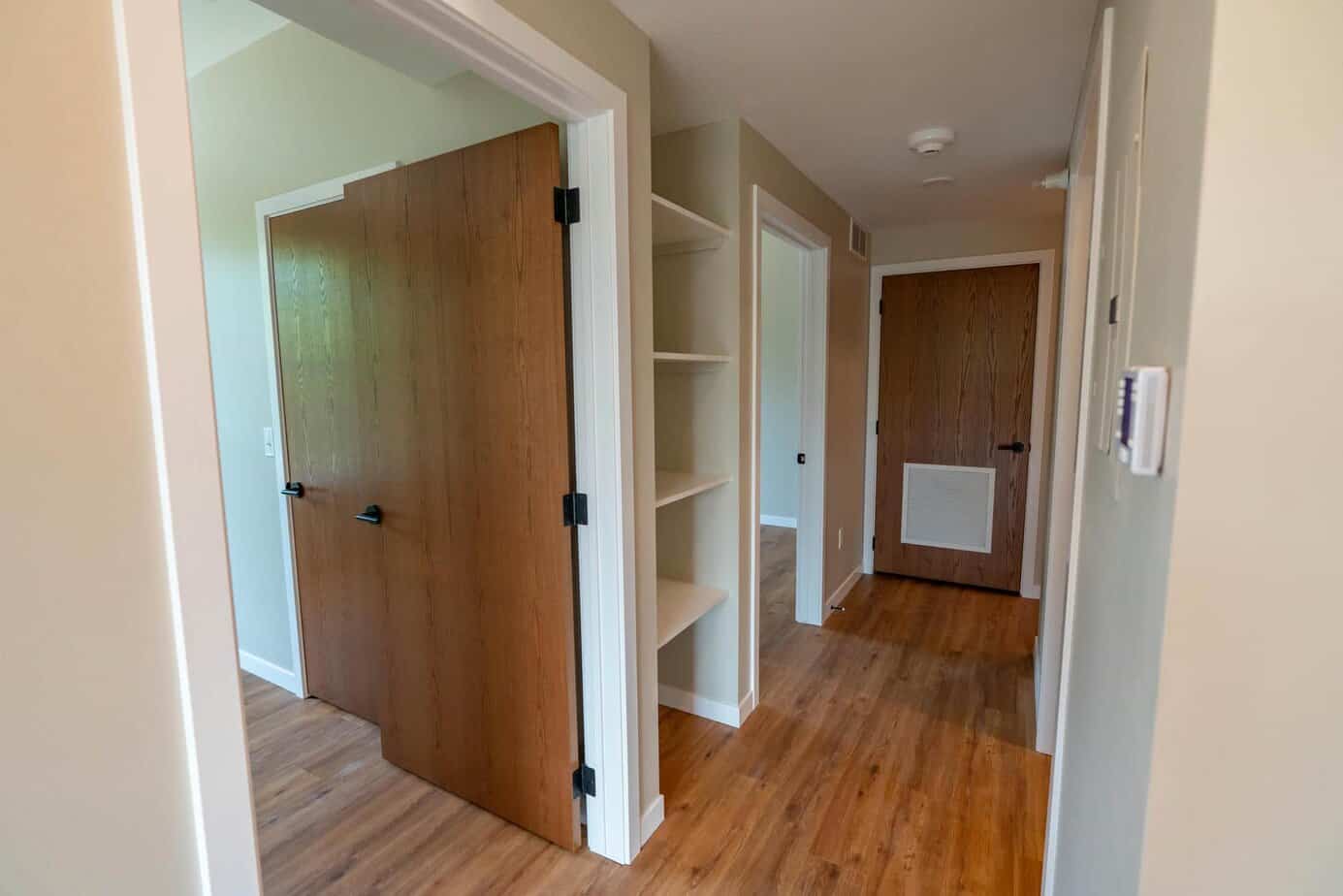 Bedrooms have sizable built-in closets and are large enough for a king-sized bed and full dresser. The open kitchen embraces functionality with stainless-steel appliances and generous modern cabinetry that cater to any culinary need. A laundry room with modern washing/drying appliances also offers plenty of extra storage. With KSU across the street and only a short walking distance to MCC and Aggieville, Apartment 1220 offers plenty on/off-street parking.