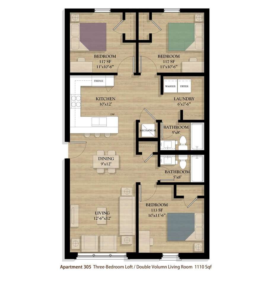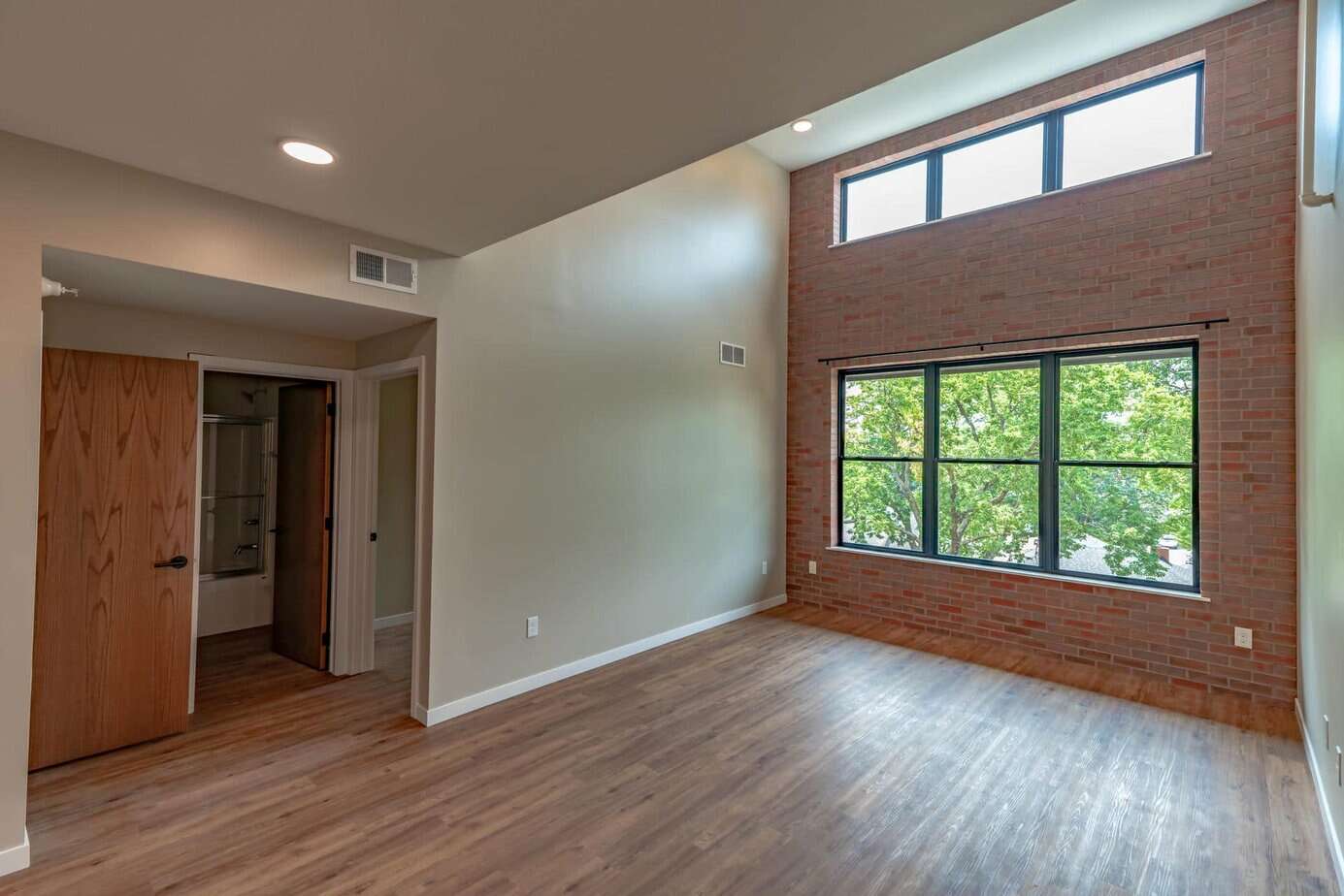 LOCATED across the street from the east side of Campus, this brand new spacious contemporary Three-Bedroom Loft accommodates an open kitchen/living room layout with large windows, plenty of natural light and exposed brick walls that give this apartment a contemporary ‘urban’ lofty texture. This top floor loft allows rare tree-top views from the ‘double-volume’ living room windows.