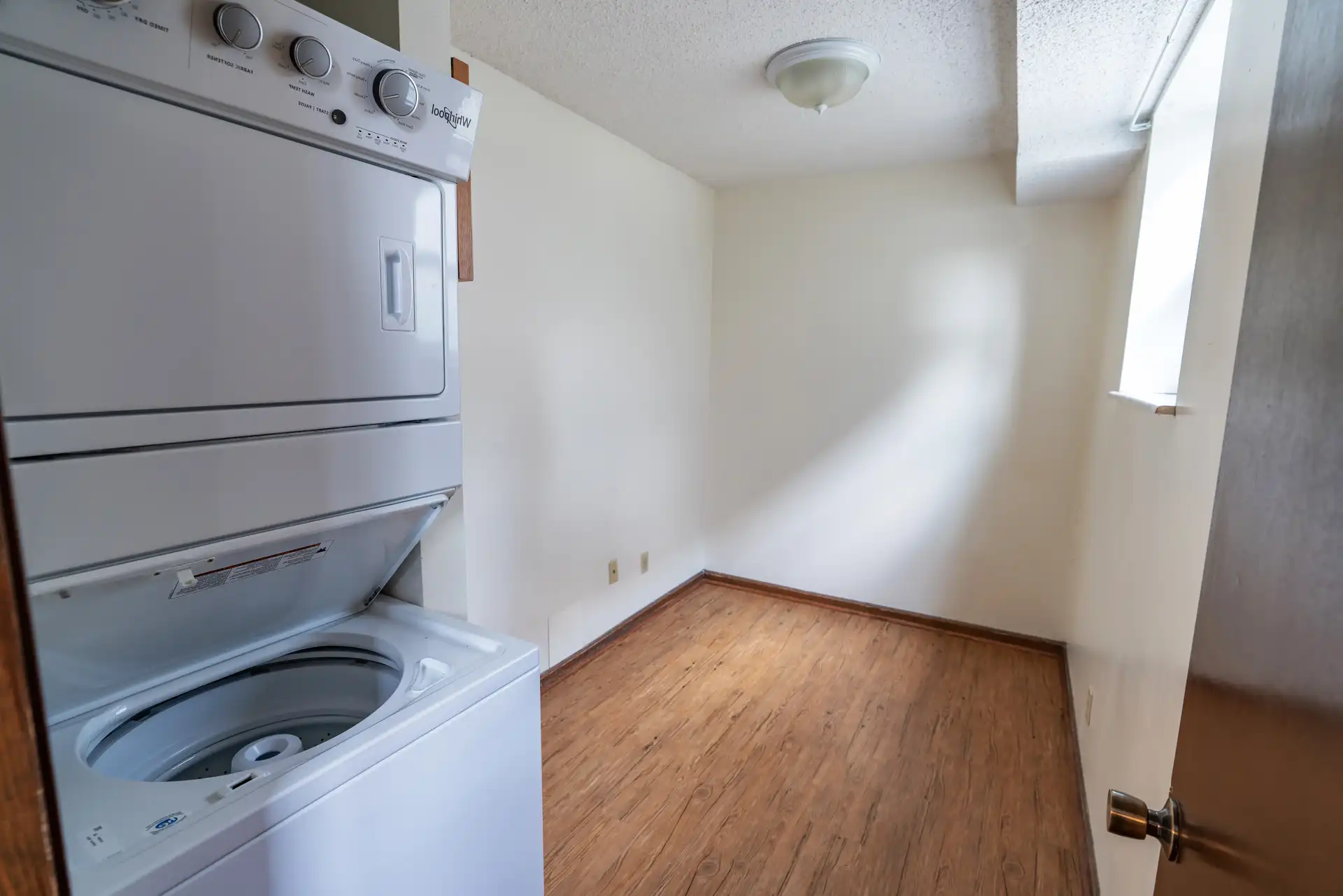 Large one bedroom.  Bedroom is large enough for a King-sized bed and full dresser. This apartment has a dining area, off-street parking, and laundry in the unit. The laundry room is big enough for storage or an office. Walking distance to KSU, MCC, and Aggieville.